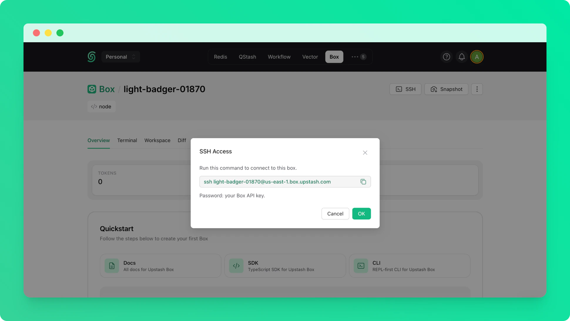Once the box is running, connect to it via SSH from your terminal. Use your Box API key as the password when prompted.
